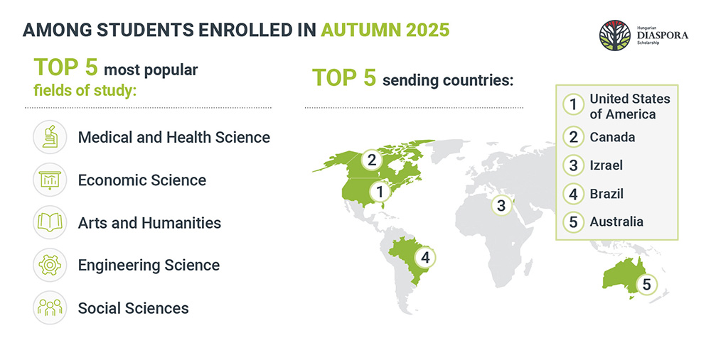 As a Diaspora Scholarship holder, you can receive an internationally recognised degree at a top-level Hungarian higher education institution and acquire highly competitive knowledge to advance both personally and academically. You can choose from a wide range of programmes taught in Hungarian that cover all higher education fields at all degree levels.